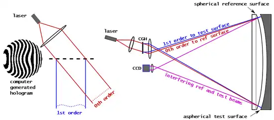 A peca de referência é, às vezes, realizada por um elemento óptico difrativo (holograma gerado por computador ou CGH), como este pode ser manufaturado por métodos litográficos de alta acurácia. Figura 2 ilustra o uso de CGHs em teste. Ao contrário da figura, CGHs reais tem espaçamento de linha na ordem de 1 a 10 µm. Quando luz laser é passada através da CGH, o feixe difratado de ordem zero não experimento modificação na frente de onda. A frente de onda do feixe difratado de primeira ordem, entretanto, é modificado para coincidir com a forma desejada da superfície de teste. Na configuração de teste do interferômetro de Fizeau ilustrado, o feixe difratado de ordem zero é dirigido em direção à superfície de referência esférica, e o feixe difratado de primeira ordem é dirigido em direção à superfície de teste de tal forma que os dois feixes refletidos se combinam para formar as franjas de interferência.[4]