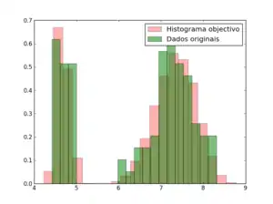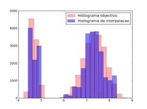 Evidentemente no sentido de se atingir uma imagem objectivo (nesta experiência por nós conhecida) não só é importante a representação visual como também a reprodução estatística dos dados. Não existe qualquer ferramenta matemática que force à reprodução do histograma na interpolação por vizinho mais próximo. Mesmo na eventualidade disso se concretizar nada garante que os dados usados na interpolação tenham a mesma distribuição univariada (histograma) que a imagem objectivo (ou área de estudo) como podemos ver na comparação seguinte entre a distribuição dos dados e distribuição da imagem objectivo: