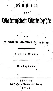 - Tennemann's interpretation of Plato appeared in his 1792, four-volume System der Platonischen Philosophie (Jena: 1792–1795) and was summarized in his influential History of Philosophy (11 volumes, 1798 – 1819). References below are to the discussion of Plato in the 1799 volume II of Geschichte der Philosophie (Leipzig: Barth, 1799).