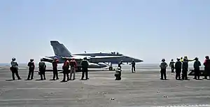 ![]() Um F/A-18C Hornet estadunidense a bordo do USS George H.W. Bush antes do lançamento das operações sobre o Iraque em 2014. | |||