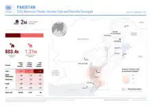 As fortes chuvas de monção e inundações afetaram 30 milhões de pessoas no Paquistão desde meados de junho, destruindo quase 218 mil casas e danificando centenas de milhares mais.[5][16][17] Sindh e Baluchistão são as duas províncias mais afetadas em termos de impacto humano e infraestrutural. Mais de 700 mil animais foram mortos,[5] a maioria deles na província do Baluchistão, enquanto a destruição de mais de 3,6 mil km de estradas e 145 pontes impediu o acesso às áreas afetadas pelas enchentes.[16] Mais de 17 560 escolas foram danificadas ou destruídas também.[16]
