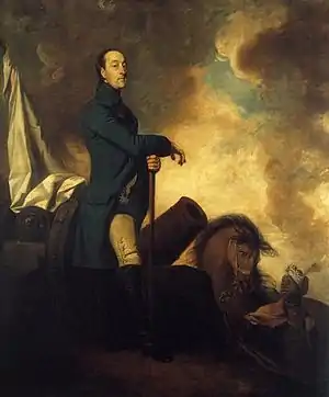 ![]() O Conde de Eschaumburgo-Lipa, comandante das forças anglo-portuguesas que derrotaram três vezes as ofensivas espanholas e francesas contra Portugal. Pintura de Joshua Reynolds. | |||