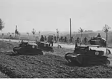 A força de tanques consistia em duas brigadas blindadas, quatro batalhões de tanques independentes e cerca de 30 companhias de tanquetes TKS ligadas às divisões de infantaria e brigadas de cavalaria.[74] O tanque padrão do Exército Polonês durante a invasão de 1939 foi o tanque leve 7TP. Foi o primeiro tanque do mundo equipado com motor diesel e periscópio Gundlach 360°.[75] O 7TP estava significativamente melhor armado do que seus oponentes mais comuns, os Panzer I e II alemães, mas apenas 140 tanques foram produzidos entre 1935 e o início da guerra. A Polônia também tinha alguns projetos importados relativamente modernos, como 50 tanques Renault R35 e 38 tanques Vickers E.