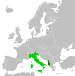 A Albânia seguiu a Itália na guerra contra a Grã-Bretanha e a França em 10 de junho de 1940. A Albânia serviu de base para a invasão italiana da Grécia em outubro de 1940, e as tropas albanesas participaram da campanha grega, mas maciçamente abandonaram a linha de frente. As áreas do sul do país (incluindo as cidades de Gjirokastër e Korçë) foram temporariamente ocupadas pelo exército grego durante a campanha, mas a Itália saiu vitoriosa depois que a Grécia capitulou aos alemães em abril de 1941. A Albânia foi ampliada em maio de 1941 pela anexação do Kosovo e partes de Montenegro e Banovina de Vardar, indo muito longe no sentido da realização das reivindicações nacionalistas para uma "Grande Albânia". Uma parte da costa ocidental do Epiro chamada Chameria também foi anexada, e colocada sob um alto comissário albanês, que exercia o controle nominal sobre o território. Quando a Itália abandonou o Eixo em setembro de 1943, as tropas alemãs imediatamente ocuparam a Albânia depois de uma breve campanha, com resistência relativamente forte.[15]