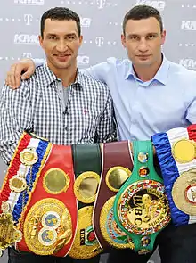 Vitali Klitschko (nascido em 19 de julho de 1971) e Wladimir Klitschko (nascido em 25 de março de 1976), conhecidos como Irmãos Klitschko, são ex-boxeadores profissionais ucranianos. Durante seus anos de pico entre 2004 e 2015, eles foram considerados os campeões mundiais de pesos-pesados dominantes de sua época e entre os campeões de maior sucesso na história do boxe. [1] [2] Em 2011, eles entraram no livro do Guinness World Records como o par de irmãos com mais vitórias mundiais na luta pelo título dos pesos-pesados (30 na época; 40 a partir de 2020). [3] [4] Nos anos seguintes à aposentadoria do campeão indiscutível dos pesos-pesados Lennox Lewis, em 2004, os irmãos Klitschko acabariam acumulando todos os quatro principais títulos mundiais de pesos-pesados. [2] [5] Conhecidos por seus estilos físicos excepcionalmente grandes e técnicas de boxe, cada um deles desenvolveu um estilo que utilizava seu atletismo e alcance de braço para derrotar os oponentes. [6] [7]