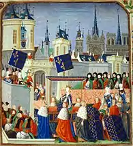 A procissão durou de manhã até a noite. As ruas estavam cheias de pintura viva (Tableau vivant) exibindo cenas das Cruzadas, Deësis e as Portas do Paraíso. Mais de mil burgueses ficaram ao longo da rota; aqueles de um lado estavam vestidos em revestimento verde, os da frente em vermelho. A procissão começou no Porte Saint-Denis e passou sob um dossel de pano azul-celeste debaixo do qual crianças vestidas como anjos cantaram, virando na Rue Saint-Denis antes de chegar em Notre Dame para a cerimônia de coroação.[9] Como Tuchman descreveu o evento, "Tantas maravilhas deviam ser vistas e admiradas que já era noite, antes da procissão atravessar a ponte que leva à Notre Dame, quando a exibição culminou."[10]