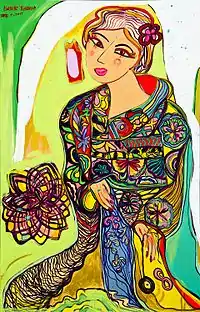 A cor viva é um elemento onipresente na obra de Isabelle Tuchband. As telas coloridas pintadas de acrílico representam geralmente mulheres, flores e mundos encantados. Isabelle adora retratar pessoas e famílias.