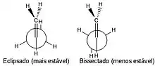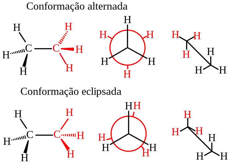 Assim para a molécula de etano, existe um número infinito de conformações em torno da ligação C-C, cada uma com certo valor de energia associado. Duas destas conformações são reconhecidas como mínimos de energia (conformações alternadas) e máximos de energia (conformações eclipsadas). Na projeção de Newman a conformação eclipsada corresponde aos ângulos de torção de 0°, 120° e 240°; e a conformação alternada aos ângulos de torção de 60°, 180° e 300°.[13]