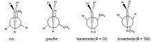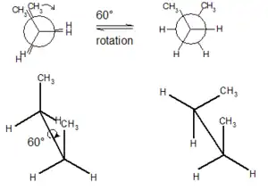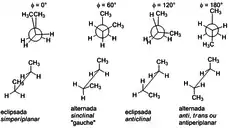 Na molécula de butano se consegue distinguir três conformações diferentes. Uma conformação alternada chamada anti, trans ou antiperiplana, onde os substituintes ficam nas posições mais afastadas (em ângulo de 180°, mais à esquerda, abaixo); a conformação gauche (ϕ = ± 60°) ”); e dois tipos de conformações eclipsadas chamadas de sinperiplana (ϕ = 0°) e anticlinal (ϕ= ±120°).[18] A relação entre a energia e o ângulo de torção por rotação em torno do C(2)-C(3) da ligação é apresentado na figura de abaixo.[19]