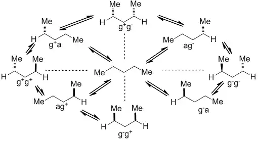 As conformações em torno das ligações C(2,3) e C(3,4) são denotadas como anti(a) ou gauche(g); o sinal + e – indica se o ângulo de torção esta perto de 60° ou -60°, respectivamente. As conformações acima da linha horizontal são conformações indistinguíveis devido ao fato de que elas têm o mesmo valor de energia. Além disso, as conformações ag+ e g+a se interconvertem mediante uma rotação de 180°, e o mesmo entre as conformações ag- e a-g. Portanto, só seis confôrmeros são distintos. Devido a fato de que o n-pentano possui duas variáveis independentes (os ângulos de torção em torno C2-3 e C3-C4) é conveniente representar as energias dos confórmeros em função de ϕ2,3 e ϕ3,4, como um diagrama de contorno.[22]