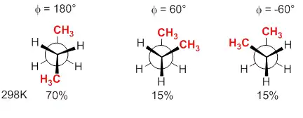 A população dos confôrmeros gauche e antino butano está definido pela constante de equilíbrio das conformações , que depende tanto de ΔG () como de ΔH° (ΔG° = ΔH° - TΔS°; onde R é a constante dos gases (1,98 cal /mol*K), T é a temperatura em condições padrão (298K))) e também do ΔS°.[16][21]