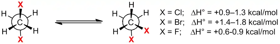 e os substituintes são grupos polares (por exemplo halogênios, nitrogênio ou oxigênio) existem outros efeitos, além dos já discutidos, que fazem que aumentam as barreiras rotacionais entre os confôrmeros. Assim, as moléculas com grupos polares possuem momento de dipolo associado, que é o responsável pela interação eletrostática entre os substituintes, afetando a barreira rotacional dos confôrmeros e a estabilidade relativa entre eles. A magnitude destas interações pode ser influenciada pela presença do solvente. Em compostos de tipo XCH2-CH2X (donde X= Cl ou Br), a conformação anti é preferencial. Este comportamento é atribuído à diminuição da repulsão dipolo-dipolo no confôrmeros anti, onde os substituintes ficam mais afastados. Embora o 1,2-difluoroetano também devesse apresentar uma repulsão quando os átomo de flúor se aproximam, o confôrmero tipo gauche é a conformação preferencial, ainda em fase gasosa.[23]