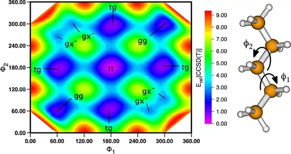 Os máximos de energia correspondem aos confôrmeros onde os ângulos de torção são ϕ2,3 = 65° e ϕ3,4 = 180° ou vice versa, o seja, os confôrmeros ag- e g+a. A conformação de menor energia é quando ϕ2,3 e ϕ3,4 são 180°.[16]
