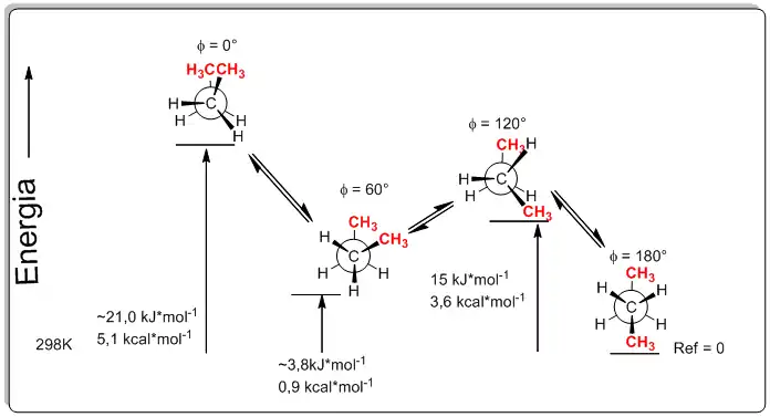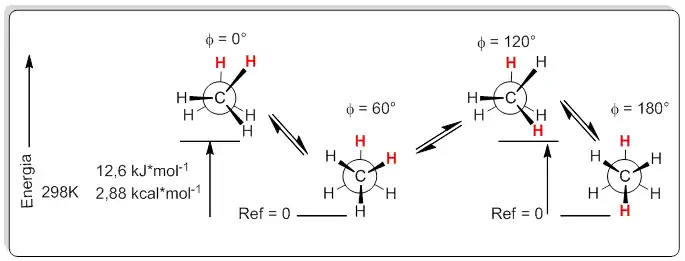 Na figura de abaixo é representado o gráfico de energia potencial em função do ângulo de torção. No gráfico de energia potencial pode-se observar que as conformações eclipsadas e alternadas correspondem aos máximos e mínimos de energia. A diferença entre as duas conformações é de 12,6 kJ/mol (ou 2.88 kJ/mol) a 25 °C. A desestabilização das conformações eclipsadas é chamada tensão torcional. Sendo esta característica resultado das características estruturais e tridimensionais de uma molécula. Devido ao fato de que as três ligações eclipasada produzem 12 kJ/mol de tensão torcional, é razoável atribuir 4,0 kJ/mol como o costo energético para cada ligação.[14]