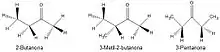 A conformação dominante da 2-butanona é anticom o hidrogênio do C(1) e o metil do C(4) eclipsados com a carbonila. A barreira rotacional C(3) – C(4) é 2,48 kcal mol−1, enquanto que a barreira C(1) – C(2) é 0,67 kcal mol−1 (Carey & Sundberg, 5ª ed.). A conformação dominante do 3-metil-2-butanona é similar (Sakurai, T. et al, 2003). Adicionalmente, no caso da 3-pentanona, estudos de difração de elétrons indicam que na conformação mais estável, a metila está eclipsada com a carbonila (Romers & Creutzberg, 1956). Portanto, a tendência é que os grupos metila prefiram estar eclipsados com o grupo carbonila.