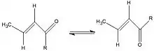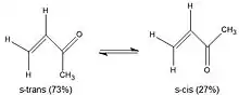 O equilíbrio entre as conformações s-trans e s-cis de cetonas α,β-insaturadas substituídas depende da extensão da interação de van der Waals entre os substituintes ligados aos carbonos C(1) e C(4) (Montaudo et al, 1973). Metil-vinil-cetona sofre o mínimo de repulsão devido e existe predominantemente como confôrmero s-trans.