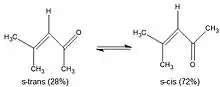 Uma interação desfavorável metil-metil desestabiliza a conformação s-trans do 4-metilpent-3-en-2-ona (óxido de mesitila) em relação à conformação s-cis e o equilíbrio favorece a forma s-cis (Carey & Sundberg, 5ª ed.).