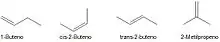 O 1-buteno possui duas conformações eclipsadas, a primeira cis, com o grupo C=CH2 eclipsado com CH3 e outra gauche (anticlinal), mais estável, com o grupo C=CH2 eclipsado com H. A barreira para a interconversão entre os confôrmeros gauche e cis é de aproximadamente 0,5 kcal mol−1. Já a barreira entre a forma gauche e as formas bissectadas é de aproximadamente 1,7 kcal mol−1 (Eliel & Wilen, 1994).