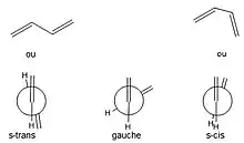 Um exemplo de sistema insaturado com ligações duplas conjugadas é o 1,3-butadieno. Sua conformação mais estável é a antiperiplanar (s-trans), com Φ = 180º, por possuir o máximo de conjugações e o mínimo de interação estérica. O termo s refere-se às conformações envolvendo as ligações simples e não as ligações duplas. As demais conformações são a gauche (Φ =60º) e s-cis (sin-periplanar, Φ =0º). A conformação planar s-cis experimenta uma repulsão de van der Waals entre os hidrogênios C(1) e C(4), que é aliviada na conformação gauche.