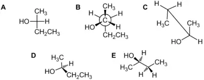 O termo conformação refere-se aos diferentes rearranjos espaciais dos átomos de uma molécula que surgem da rotação em torno das ligações entre determinados grupo de átomos, e uma conformação específica é chamada um confórmero ou isômero conformacional.[9] Portanto, isómeros conformacionais são estereoisómeros que podem ser convertidos um no outro pela rotação em torno de uma ligação simples. Os isômeros conformacionais são representados pelas formulas de projeção, as quais indica a disposição espacial relativa dos átomos através de suas ligações numa molécula.[10] São exemplos das formulas estereoquímicas as projeções de Fischer (A), Newman (B), cavalete(C), cunha(D) e ziguezague (E).[11]