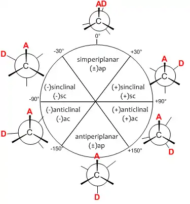 Os rearranjos correspondentes para os ângulos de torção entre 0 e (±) 90° são chamados sin, e aqueles que correspondem aos ângulos de torção (±) 90 e 180° são denominados anti. Da mesma forma, os arranjos correspondentes para ângulos de torção entre os ângulos de 30° e 150 ° ou entre -30 °C e -150° são chamados clinal e aqueles entre as 0 ° e 30 ° ou 150 ° e 180 ° são chamados periplanos. Os dois tipos de condições podem ser combinados de modo a definir quatro intervalos de ângulo de torção; 0 ° e (±)30° sin-periplano (sp); 30 ° a 90 ° e -30 ° a -90 ° sinclinal (SC); 90 ° a 150 ° e -90 °C a -150 ° anticlinal (ac); ± 150 ° a 180 ° antiperiplano (ap).[8]