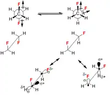Este fato pode ser explicado pela combinação de uma energia de repulsão de van der Waals relativamente baixa (em comparação com bromo ou cloro), devido ao pequeno tamanho do átomo de flúor, mais as duas interações de hiperconjugação no confôrmero tipo gauche, ilustrado na figura de abaixo.[24][25] A fim de utilizar os dois átomos de flúor simultaneamente em este tipo de interação, as duas ligações C-F devem estar ortogonais entre si, sendo esta interação ótima em um ângulo de torção de 90º onde a energia é mínima[23][26]