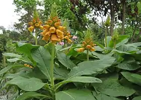As flores desta planta são subsésseis reunidas em cachos densos, terminais, glanduloso-pubescentes; corola de 2-3,5 centímetros e laranja-amarelada com linhas purpurescentes, de tubo cilíndrico-campanulado, lábio superior inteiro e lábio inferior com 3 lobos.