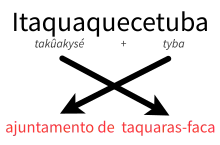 A rigor, o topônimo significa ajuntamento ou reunião de taquaras-faca (uma espécie de taboca ou taquara com cujos ramos, cortantes, se faziam facas), e é formado pela composição de takûara (taquara, taboca), kysé (faca) e tyba (ajuntamento, reunião, abundância), referindo-se a um imenso taquaral que existia na aldeia, no tempo de sua fundação, margeando os rios Tietê e Tipóia. O "i" parece que é uma prefixação arbitrária, isto é, não vem do tupi, e talvez tenha sido motivado pela grande quantidade de topônimos formados pela palavra pedra em tupi, que é itá. Em Itaquaquecetuba, passa a linha imaginária do Trópico de Capricórnio.[24]
