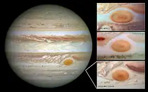 A característica mais marcante de Júpiter é a Grande Mancha Vermelha, uma tempestade anticiclônica persistente, localizada 22° ao sul do equador, que, com dimensões de 24-40 mil km x 12-14 mil km, pode abrigar dois ou três planetas com o diâmetro da Terra.[51] Sabe-se de sua existência desde ao menos 1831,[52] e, possivelmente, 1665.[53] Imagens do telescópio espacial Hubble mostraram duas “manchas vermelhas” adjacentes à Grande Mancha Vermelha.[54][55] Modelos matemáticos, em 2007, sugeriram que a tempestade era estável e poderia ser uma característica permanente do planeta;[56] entretanto a tempestade diminuiu até 17 graus desde os anos 1800, quando ela poderia ter alcançado 5 600 ou quatro vezes o diâmetro da Terra. Atualmente, ela é cerca de 1,3 vezes o tamanho da Terra. Ela pode desaparecer completamente nos próximos 20 anos.[57]