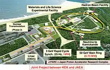 J-PARC (Complexo de pesquisa do acelerador de prótons do Japão) é a instalação de um acelerador de alta intensidade de prótons. É um projecto conjunto entre a KEK e JAEA e está localizado em Tokai no campus da JAEA. J-PARC visa a fronteira em ciências dos materiais e ciências da vida, e nuclear e física de partículas. J-PARC usa feixes de prótons de alta intensidade para criar secundário feixes de nêutrons, hádrons, e neutrinos de alta intensidade.[1]