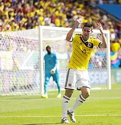 Durante a Copa do Mundo FIFA de 2014, James se destacou, sendo a grande revelação da competição. Ele marcou nas três primeiras partidas da fase de grupos, contra a Grécia, Costa do Marfim e um golaço diante do Japão. Nas oitavas de final contra o Uruguai, completou o quarto jogo marcando dois gols, inclusive um golaço de fora da área que foi eleito pela FIFA como o gol mais bonito do mundial, assim tornando-se o principal responsável pela classificação da equipe às quartas de finais. Nas quartas de finais a Colômbia foi derrotada pelo país anfitrião, o Brasil por 2 a 1, onde James não fez uma boa partida, mas marcou um gol de pênalti. Programas esportivos no país do futebol exaltam a qualidade deste jogador, principalmente, após marcar os gols da classificação da equipe às quartas. Além disto, as comparações não se resumem somente ao estilo deste grande jogador, mas justamente ao principal jogador da Seleção Brasileira, Neymar. James Rodriguez terminou a Copa do Mundo com 6 gols marcados em 5 partidas, ao todo, assim foi o artilheiro do mundial, recebendo a Chuteira de Ouro.[80]