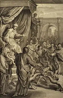 «Então Moisés e Arão foram a Faraó, e fizeram assim como o Senhor ordenara; e lançou Arão a sua vara diante de Faraó, e diante dos seus servos, e tornou-se em serpente. E Faraó também chamou os sábios e encantadores; e os magos do Egito fizeram também o mesmo com os seus encantamentos. Porque cada um lançou sua vara, e tornaram-se em serpentes; mas a vara de Arão tragou as varas deles.» (Êxodo 7:10–12)[3]