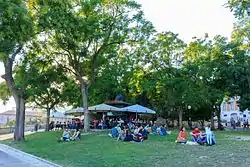 Foi baptizado com o nome de Pedro Amaral Botto Machado, político republicano português. Possui um parque infantil, bar com esplanada e mesas de jogo.