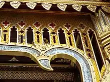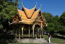Produzido em Banguecoque seguiu métodos tradicionais em madeira de teca revestida a folha de ouro e decorado por vitrais coloridos e brilhantes. A sua cobertura está revestida com placas que lembram a pele de um dragão ou as escamas de um peixe. Já os pináculos representam anjos estilizados. Foi montado com encaixes na madeira sem o uso de metais não tendo por isso um único prego ou parafuso.