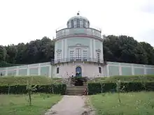 O pavilhão foi construído com quatro pavimentos e possui arquitetura rococó tardia, de planta circular e cobertura em forma de cebola. No primeiro pavimento se localiza a cozinha e áreas de serviço. No segundo pavimento se localiza um salão e uma sacada. A decoração interior foi feita pelos artistas Giuseppe del Moro, Giuliano Traballesi e Pasquale Micheli, que utilizaram no piso um revestimento de terracota em formato retangular e hexagonal e blocos de mármore branco.[9]