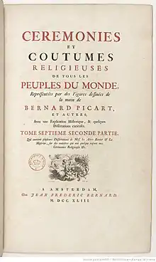 - Bernard, Jean-Frédéric (1723-1743), Ceremonies et Coutumes Religieuses de tous les Peuples du Monde, Representées par des Figures dessinées de Ia main de Bernard Picard, etc. Avec une explication Historique, & quelques Dissertations curieuses. 9 vols. Amsterdã: JF Bernard.