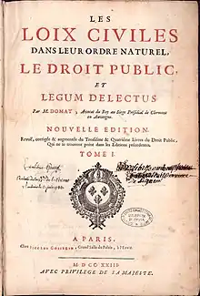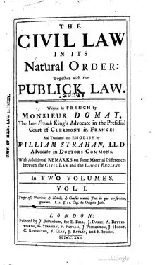 - Jean Domat (1722), The Civil Law in Its Natural Order: Together with the Publick Law. Written in French by Monsieur Domat, The Late French King's Advocate in the Presidial Court of Clermont in France: and Translated into English by William Strahan, LL. D. Advocate in Doctors Commons. With Additional Remarks on Some Material Differences between the Civil Law and the Law of England. In Two Volumes. 1st English ed. , London: Printed by J. Bettenham, for E. Bell, J. Darby, A. Bettesworth, G. Strahan, F. Fayram, J. Pemberton, J. Hooke, C. Rivington, F. Clay, J. Batley, and E. Symon, OCLC 642758091.