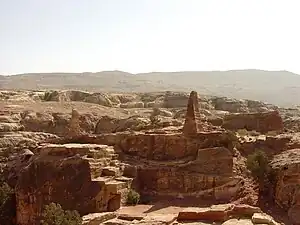 As procissões religiosas dos nabateus ascendiam ao altar a partir da área adjacente ao Anfiteatro de Petra, passando pelo vale até o ponto de acesso para uma longa escadaria esculpida nas pedras, até alcançar o altar onde os sacrifícios eram realizadas. A primeira coisa a ser observada eram os obeliscos escavados na pedra que simbolizam os deuses nabateus Duxara - o deus do poder, e Uzá - a deusa da fertilidade e da água . Restos de muralhas e de uma torre que acreditam serem edomitas também foram reutilizados no período nabateu.[3]