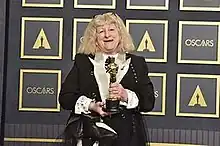 Jenny Beavan com sua estatueta do Oscar de Melhor Figurino por "Cruella" em 2022