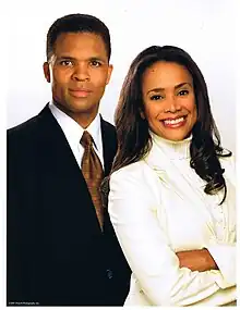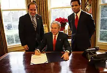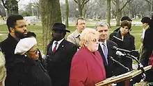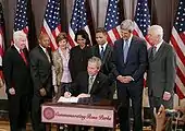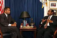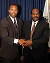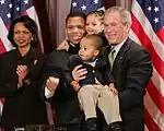 Esquerda:O Presidente dos Estados Unidos George W. Bush, Richard Lugar, Alphonso Jackson, Laura Bush, Condoleezza Rice, Jackson, John Kerry, Thad Cochran; Direita: Jackson e seus filhos (Jesse III e Jessica), Bush e Rice 1 de dezembro de 2005 | ||