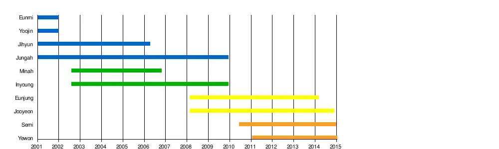 - Cho Min-ah (hangul: 조민아), nascida Cho Jin-joo (hangul: 조진주) em 23 de junho de 1984 (39 anos) em Masan, Gyeongsang do Sul, Coreia do Sul.[33]