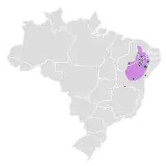 É distribuído no árido Nordeste do Brasil, exclusiva da caatinga, desde o nordeste do Piauí ate o norte de Minas Gerais; ocorre também no interior dos estados do Ceará, Rio Grande do Norte, Bahia, Paraíba, Pernambuco, Sergipe e Alagoas.[4][7]