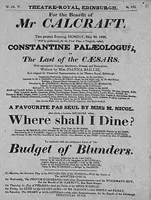 - 1821 De Monfort [“sic”] foi apresentado no teatro Drury Lane, Londres, com Edmund Kean no papel principal. Constantine Paleologus, embora escrito com John Kemble e Sarah Siddons em mente, foi recusado pelo teatro Drury Lane. Foi encenado no Surrey Theatre como um melodrama, Constantine and Valeria, e em sua forma original em Liverpool, Dublin e Edimburgo.