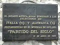 "El Estadio Azteca rinde homenaje a las selecciones de: Italia (4) y Alemania (3), protagonistas en el Mundial de 1970, del 'Partido del Siglo' - 17 de junio de 1970". ("O Estádio Azteca presta homenagem às seleções de: Itália (4) e Alemanha (3), protagonistas na Copa do Mundo de 1970, do 'Jogo do Século' - 17 de junho de 1970".)