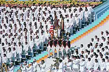 A cerimônia de entrega de medalha é realizada após a realização de cada evento olímpico. O vencedor, segundo e terceiro lugar, sendo competidores individuais ou equipes, sobem no alto de uma tribuna em três níveis e são atribuídas suas respectivas medalhas.[117] Após as medalhas serem distribuídas por um membro do COI, as bandeiras nacionais dos três medalhistas são levantadas enquanto o hino nacional do país do medalhista de ouro é executado.[118] Cidadãos voluntários do país-sede também atuam como anfitriões durante a cerimônia de medalhas, já que ajudam os funcionários a entregarem as medalhas e atuam como porta-bandeiras.[119] Para cada modalidade olímpica, a respectiva cerimônia de medalhas é realizada, no máximo, um dia depois do final do evento. Para a maratona masculina, a competição é normalmente realizada no início da manhã do último dia de competição olímpica e a sua cerimônia de medalhas, em seguida, é realizada à noite durante a cerimônia de encerramento. Nas Olimpíadas de 2020, as medalhistas da maratona feminina também foram premiadas na cerimônia de encerramento, como parte da política de igualdade de gêneros.[120]