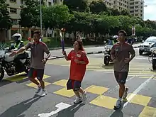 O desenho da tocha que carregou a chama olímpica foi projetado para combinar os elementos fogo e água. A parte de cima foi reflexivo e agiu como uma espelho, levando as imagens e os elementos de Singapura. O fogo representou a juventude e a água a cidade anfitriã, devido suas origens como um porto marítimo e posteriormente uma cidade-estado insular. A tocha foi feita de alumínio e revestida com um material antiderrapante.[27] Comparada a tocha utilizada nas Olimpíadas de 2010, em Vancouver, que pesava 1,6 kg,[28] essa era bem mais leve, pesando cerca de 740 gramas e com 60 centímetros de comprimento.[27]