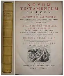 O Novum testamentum graecum de Mill (Oxford, fol. 1707) foi realizado com o incentivo de John Fell, seu predecessor no campo da crítica do Novo Testamento; o livro levou trinta anos para ser concluído e foi um grande avanço em relação aos estudos anteriores. O texto é de Robertus Stephanus (1550), mas as notas, além de incluirem todas as coleções previamente existentes de várias leituras, adicionam um vasto número derivado de seu próprio exame de muitos manuscritos e versões orientais (a última das quais ele usou apenas nas traduções latinas).