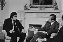 Quando convidado para se apresentar na Casa Branca pela primeira vez em 1970,[99] o escritório de Richard Nixon solicitou que ele tocasse " Okie from Muskogee " (uma canção satírica de Merle Haggard sobre pessoas que desprezavam hippies, jovens usuários de drogas e manifestantes da Guerra do Vietnã), "Welfare Cadillac" (uma canção de Guy Drake que castiga a integridade dos beneficiários da previdência social) e "A Boy Named Sue". Cash se recusou a tocar as duas primeiras e, em vez disso, selecionou outras músicas, incluindo "The Ballad of Ira Hayes" e suas próprias composições, "What Is Truth" e "Man in Black". Cash escreveu que as razões para negar as escolhas musicais de Nixon foram não conhecê-las e ter um prazo relativamente curto para ensaiá-las, ao invés de qualquer motivo político.[100] No entanto, acrescentou Cash, mesmo que o escritório de Nixon tivesse dado a Cash tempo suficiente para aprender e ensaiar as canções, a escolha de peças que transmitiam sentimentos "anti-hippie e antinegros" poderia ter saído pela culatra.[98] Em seus comentários ao apresentar Cash, Nixon brincou dizendo que uma coisa que aprendeu sobre ele foi que não lhe diziam o que cantar.[101]