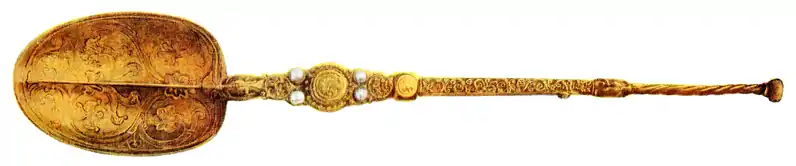 A Colher de Coroação de 27 centímetros de comprimento (10,6 polegadas), que data do final do século XII, é de prata dourada e incrustada com quatro pérolas adicionadas no século XVII. Uma crista divide a tigela ao meio, criando sulcos nos quais o Arcebispo de Cantuária mergulha dois dedos e unge o monarca, confirmando-o como Governador Supremo da Igreja da Inglaterra. Originalmente, a colher pode ter sido usada para misturar água e vinho em um cálice, e foi usada pela primeira vez para ungir um monarca na coroação inglesa de Jaime I em 1603. É a peça mais antiga de regalias, registrada pela primeira vez no Royal Collection em 1349 como "uma colher de forma antiga", e provavelmente foi feita para Henrique II ou Ricardo I. Em 1649, Oliver Cromwell vendeu a colher para Clement Kynnersley, o Senhor do Guarda-Roupa Removedor, que devolveu a Carlos II após a restauração da monarquia.