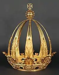 A Coroa é composta por oito semiarcos que se encontram ao topo em um orbe, o “globus cruciger”, encimado por uma Cruz de Cristo; ela é forrada internamente por veludo verde escuro, mesma cor do Manto Imperial.[5]